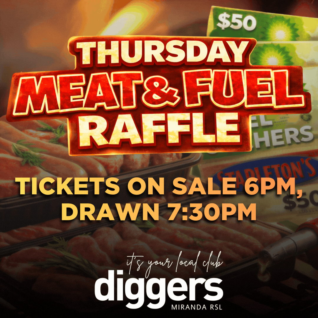 Join us every Thursday at Diggers Miranda RSL for your chance to win big with our Meat & Fuel Raffles!